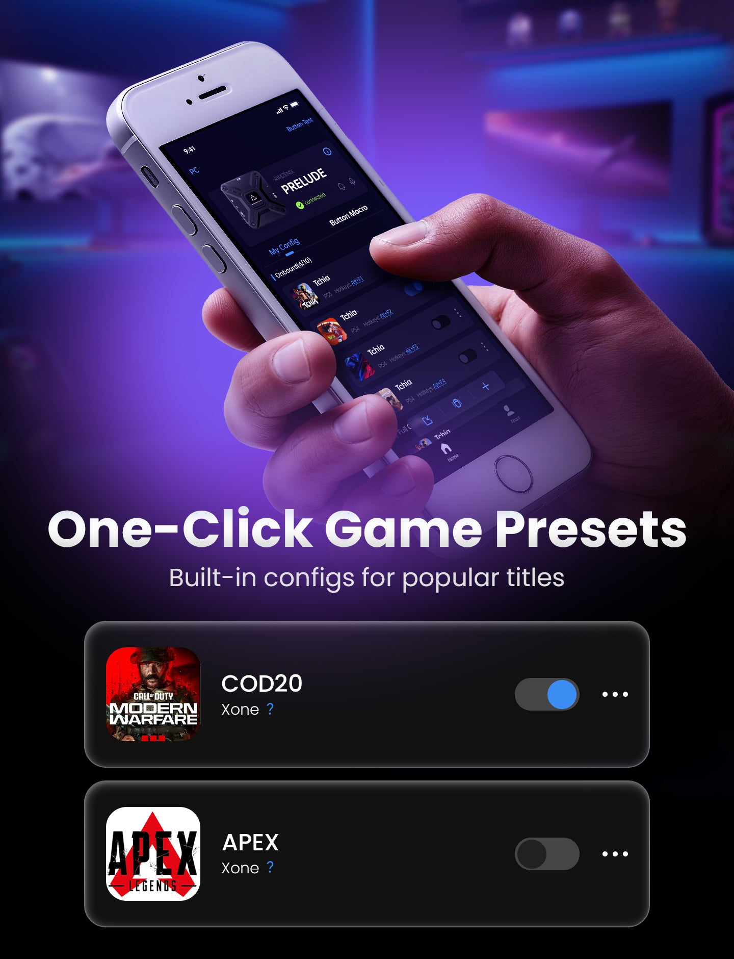 Built-in configurations for top games like Call of Duty, Apex Legends, Zelda: Tears of the Kingdom, and more.